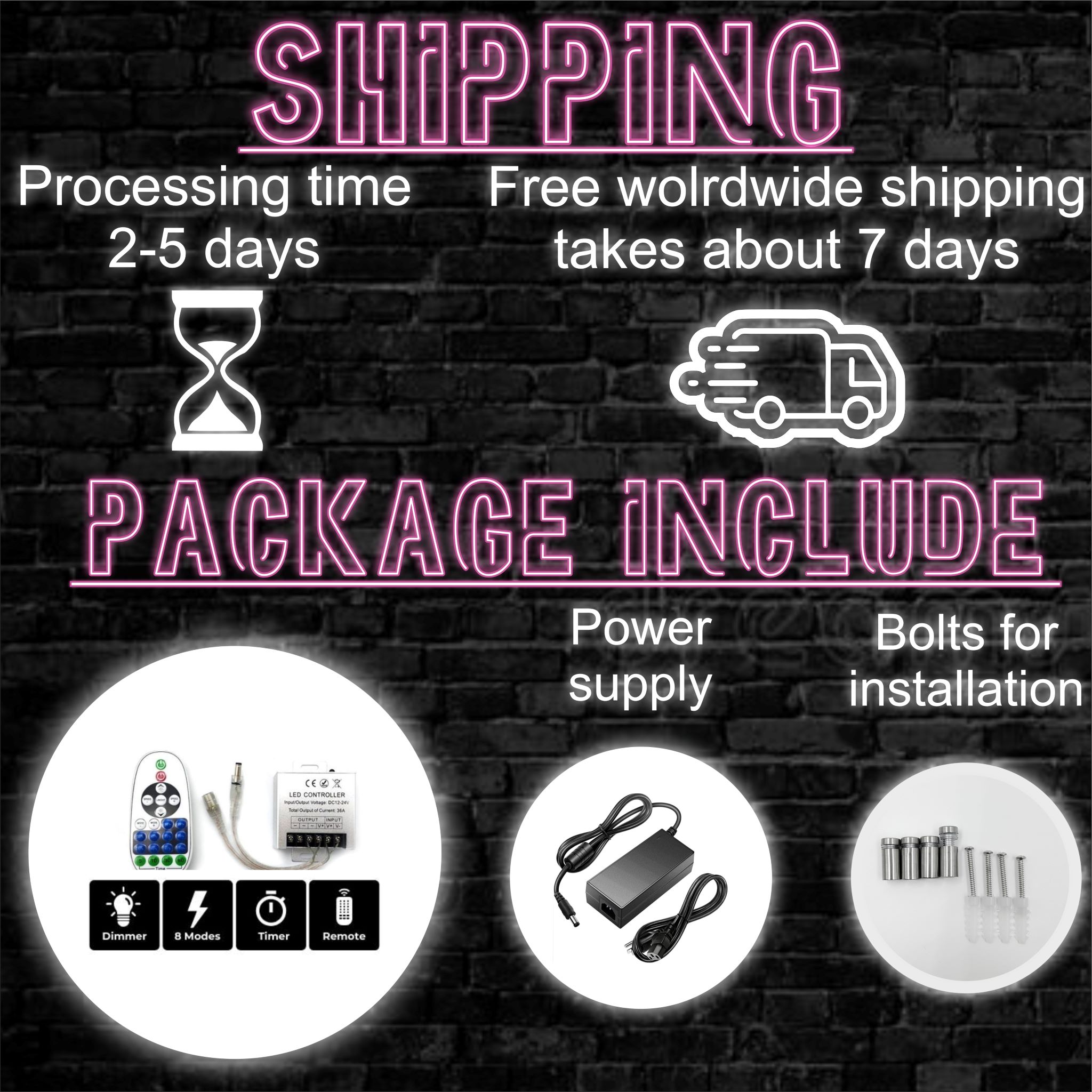 Shipped within 2-5 business days after you place your order. Delivery time takes about 5-10 business days, thanks PVC packaging your led neon sign will be delivered to you safe and sound!